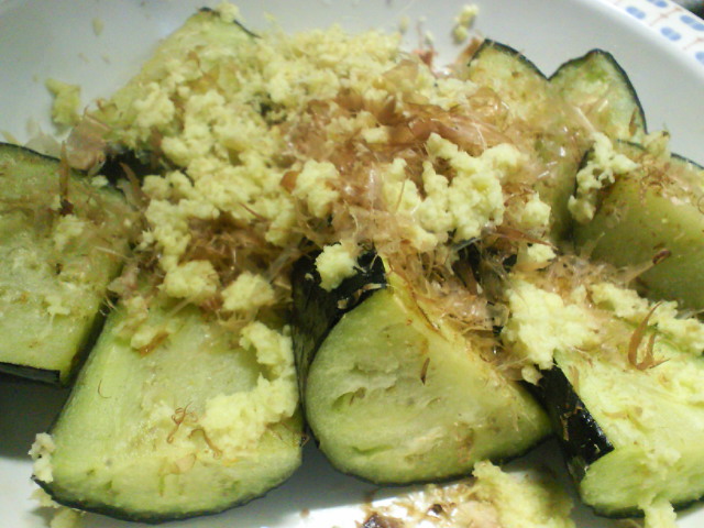 作り方は、ただナスを一口大より少し大きめで切り、オリーブオイルで揚げて、すりおろした生姜と鰹節をかけ、お醤油をかけていただきます!!